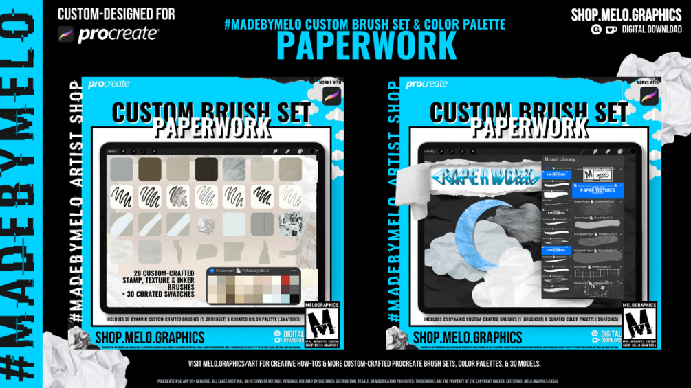From pixels to paper - make your digital art analogue with the PaperworkProcreate Brush Set and Color Pallete! This new bundle features 28 Procreate brushes expertly-crafted for creating paper textures, scrapbooks, and those perfect torn effects. Whether you're doodling away or bringing your creative thoughts to life, these brushes offer a variety of pens and markers to make your artwork pop on your iPad with the Procreate App (v 5+). Say goodbye to boring and hello to endless possibilities! This new Procreate Custom Bundle by MELOGRAPHICS also includes a curated color palette ft. 30 hand-selected swatches organized into one color palette. Now, you can easily create paper-like designs from various sources like newspapers, paper bags, and kraft paper, all with the convenience of one procreate color palette.