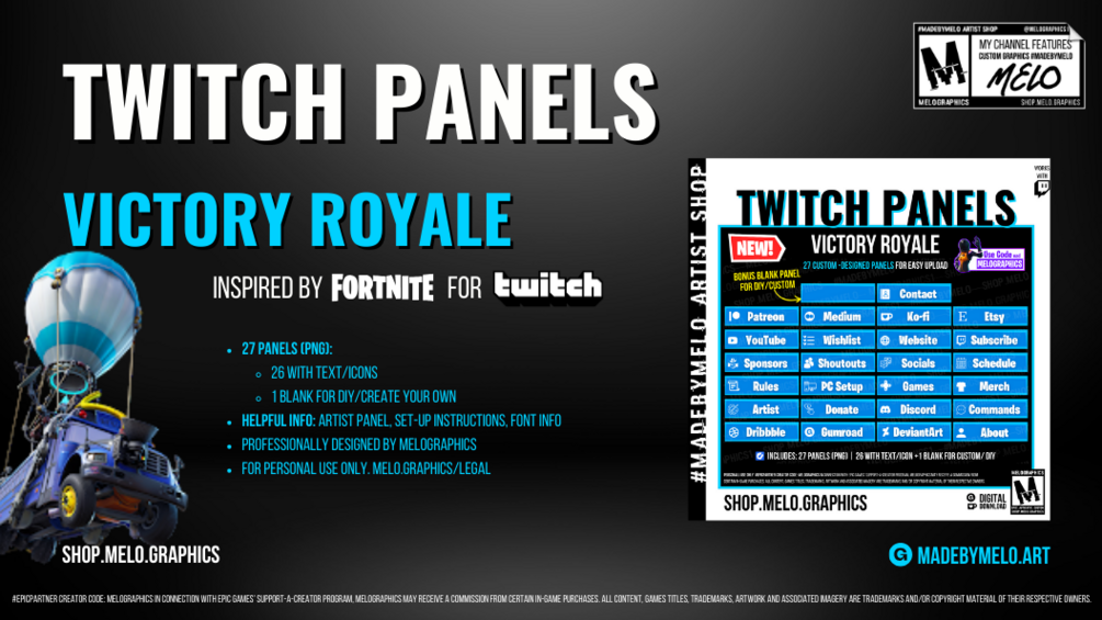 To celebrate the new Fortnite season, download the NEW Victory Royale Twitch Panels by #MadeByMELO. This streamer bundle features 26 video game-inspired Twitch panels custom-designed and optimized for instant upload to Twitch PLUS a BONUS DIY blank twitch panel and Fortnite-inspired font information to make more with your own panel personalized text. Level-up your game and stream with the Fortnite inspired custom twitch panel bundle from the #MadeByMELO Artist Shop now!